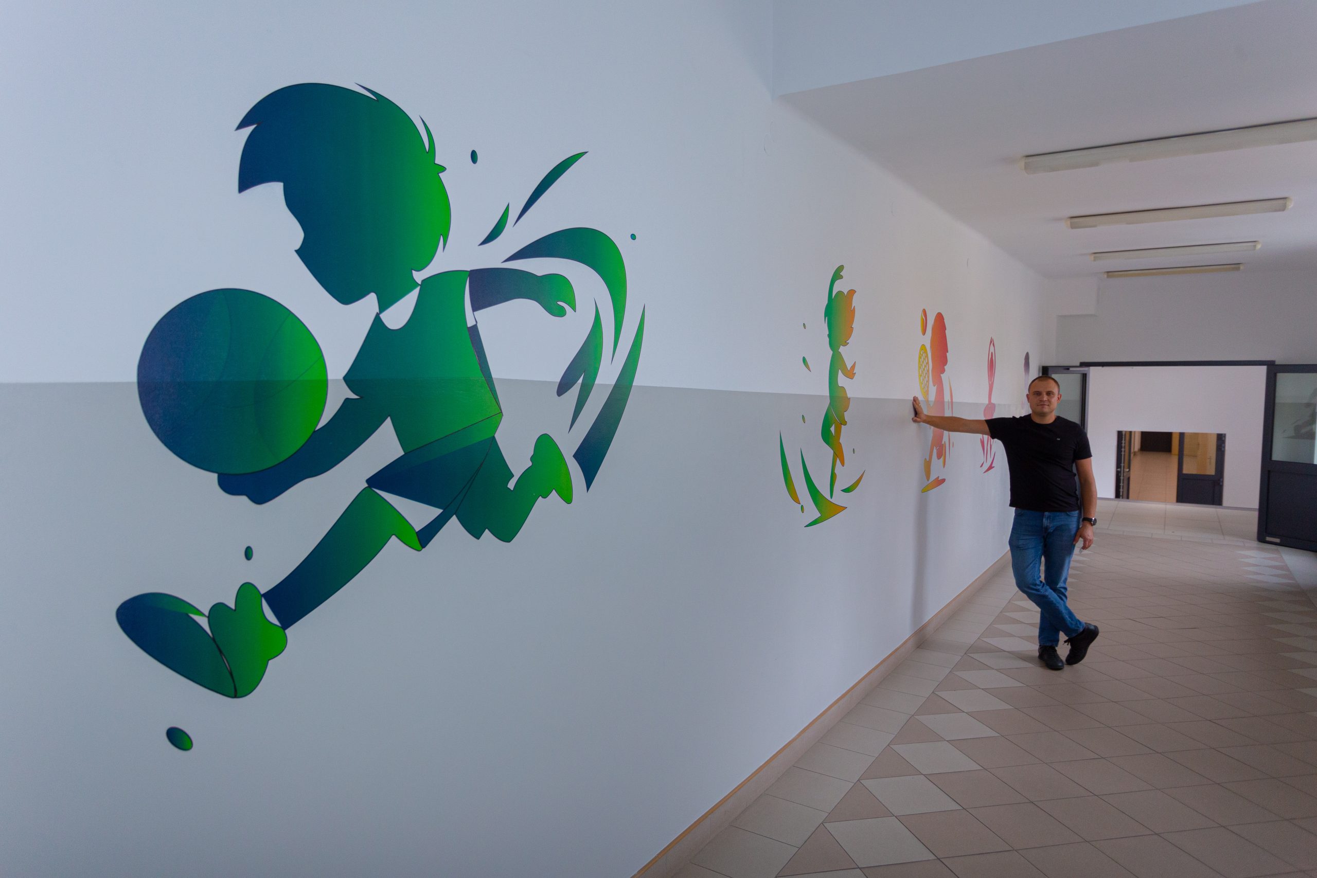 Kolorowo i wesoło, takie nadruki wykonaliśmy w pobliskiej szkole podstawowej w korytarzu łączącym główny budynek z salą gimnastyczną. Podczas realizacji mieliśmy wielu małych kontrolerów jakości dzięki którym realizacja zakończyła się pełnym sukcesem 🙂